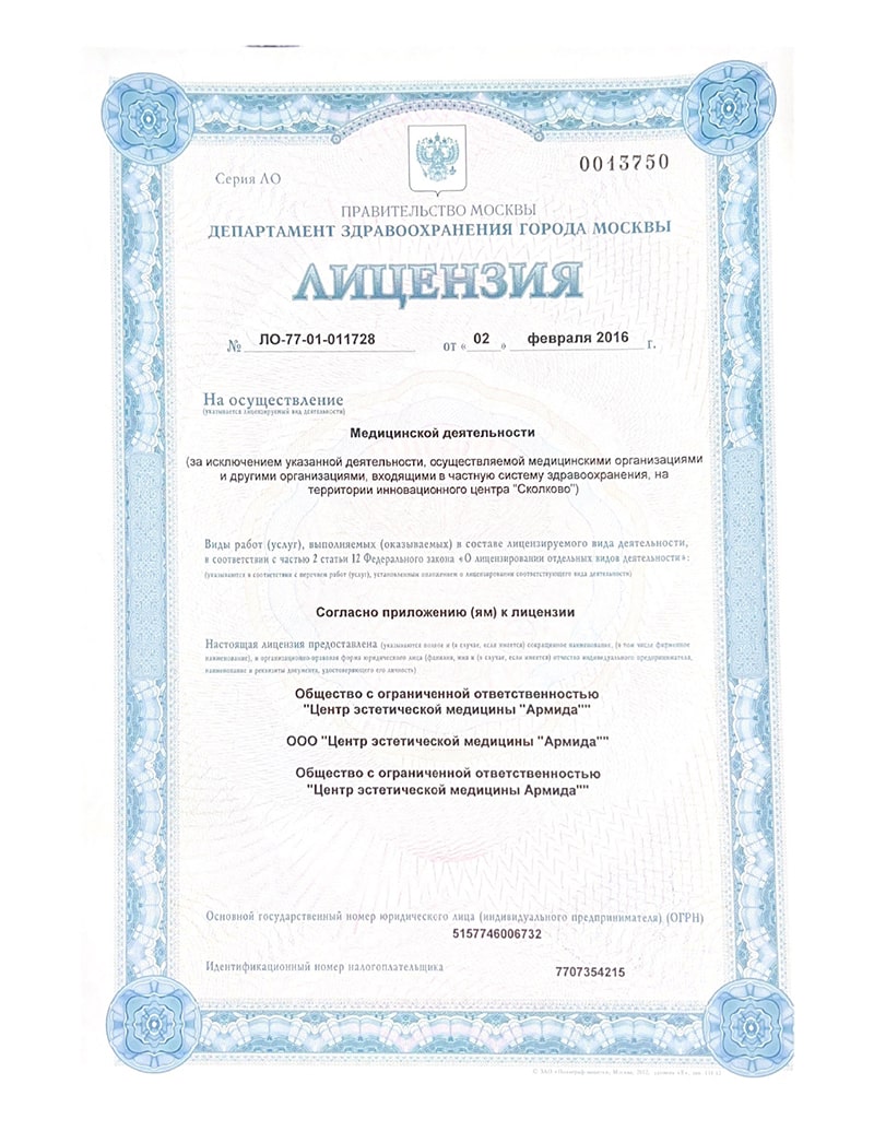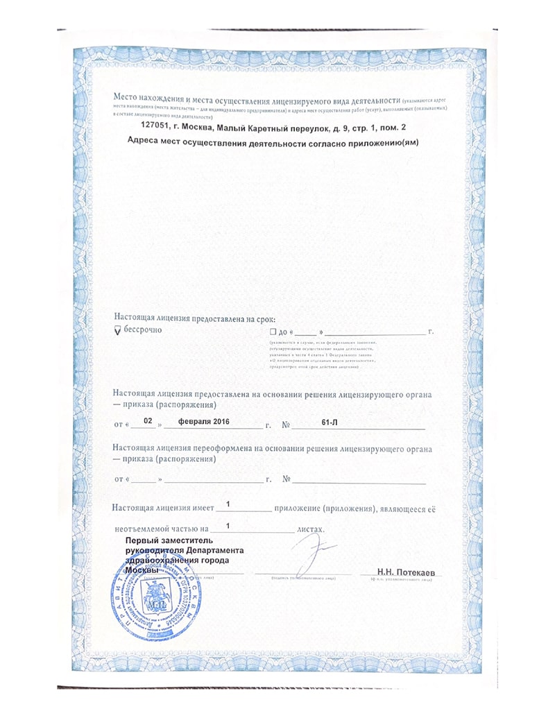 Лицензия на осуществление медицинской деятельности (оборотная сторона)